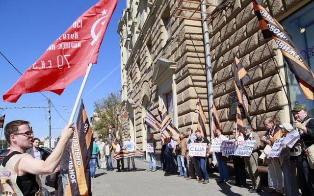 Участники массового пикета протестовали против вмешательства США в дела суверенных стран, геноцида русских на Украине, бомбардировок Сирии, поддержки ИГИЛ.